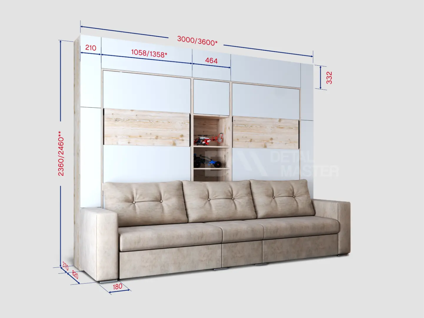 Дополнительные опции, такие как: освещение, зарядное устройство, розетки, мягкое изголовье, матрас, мягкий борт - не входят в стоимость шкаф-кровати "Twin". Вы всегда можете самостоятельно их добавить в опциях или написать менеджеру при оформлении заказа.