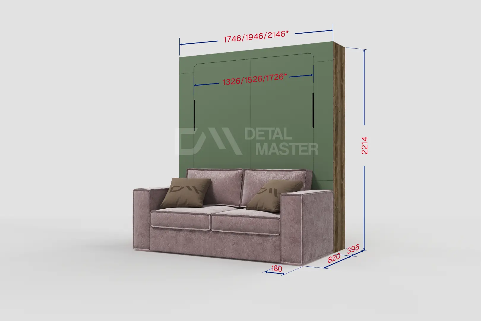 Фасад шкаф-кровати выполнен из МДФ супер матовый Фисташка, со сглаженными краями. Что позволит обезопасить вас от ударов при ходьбе возле кровати в разложенном положении и добавит изысканность модели шкаф-кровати. Корпус выполнен из ЛДСП декор Кейптаун. По бокам модель оснащена полками для хранения вещей с закрывающимися дверцами.